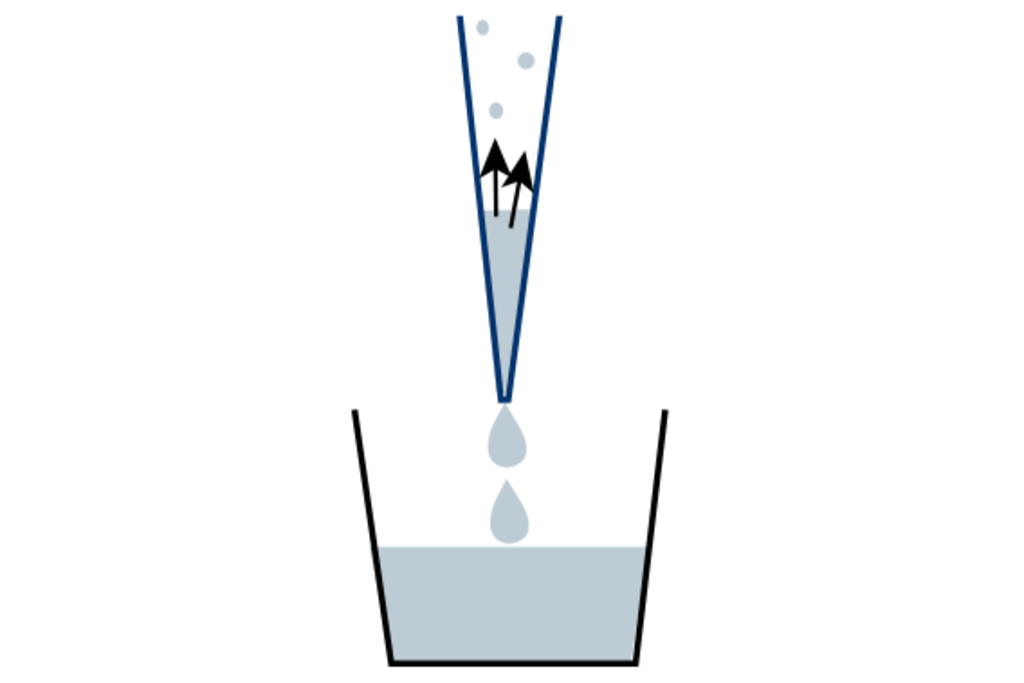 Die Volumenaufnahme bestimmt, wie viel Flüssigkeit tatsächlich abgegeben werden kann, und ist besonders fehleranfällig. Eine schräg eingetauchte Pipettenspitze verändert den hydrostatischen Druck in der Spitze und kann zusammen mit einer falschen Eintauchtiefe die Volumengenauigkeit beeinträchtigen. Je nach Zielvolumen benötigt die Pipette mehr oder weniger Zeit, um die Flüssigkeit vollständig anzusaugen.